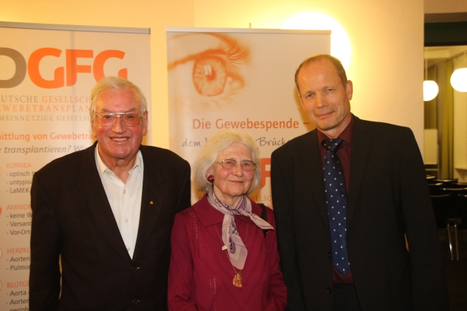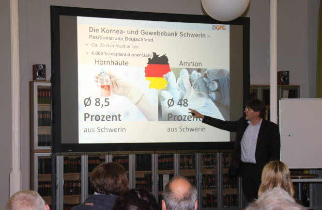 DGFG und HELIOS Kliniken Schwerin haben in einer Jubiläumsveranstaltung im Oktober 2016 an die Anfänge vor zehn Jahren erinnert. Franzel Simon ist Regionalgeschäftsführer der HELIOS Region Nord und einer der Geschäftsführer der Gewebebank. Er berichtete über die hervorragende Versorgung der Patienten mit Augenhornhäuten und Amnionpräparaten in Mecklenburg-Vorpommern. Martin Börgel, Geschäftsführer der DGFG und ebenfalls Geschäftsführer der Gewebebank, blickte auf zehn Jahre enge Zusammenarbeit zurück. Er fasste die Situation der Gewebespende in Deutschland zusammen: „Die Wartezeit auf ein Hornhauttransplantat ist in den vergangenen zehn Jahren von mehr als sechs Monaten auf wenige Wochen zurückgegangen.“ Inzwischen kommt fast jede zehnte in Deutschland transplantierte Hornhaut aus Schwerin. Prof. Dr. Frank Wilhelm, Gründervater der Gewebebank, hat die Entwicklung der Einrichtung von Anfang an begleitet. „Eine Hornhauttransplantation ist immer die letzte Möglichkeit, um Patienten das Augenlicht zu retten.“