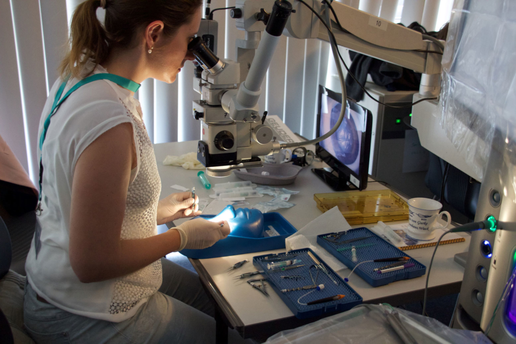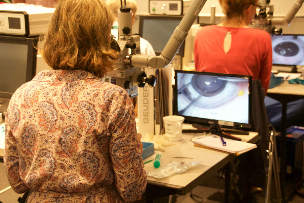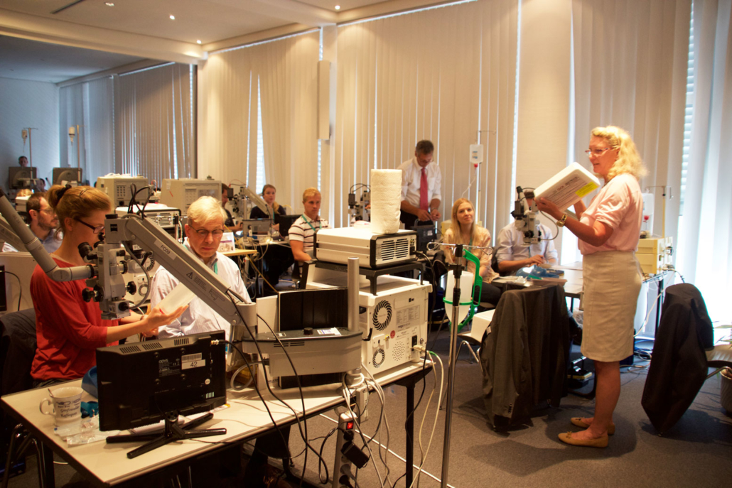 Drei Tage im Zeichen der Traumatologie des Auges. Die Augenchirurgie hat schon tausenden Patienten das Augenlicht gerettet. Vom 7. bis 9. Juli 2016 fand im BioTechnikum Greifswald die Sommerakademie für Ophthalmochirurgie (Teilgebiet der Augenheilkunde) statt. Veranstalter waren die Gemeinschaftspraxis „Augen im Zentrum“ Greifswald, die Knappschafts-Augenklinik Sulzbach, die Universitätsaugenklinik München und mts – the wetlab company. Am ersten Lehrgangstag, geleitet von Prof. Dr. Frank Wilhelm, Augenarzt der Gemeinschaftspraxis „Augen im Zentrum“ am Standort Greifswald, drehte sich alles um den Augenvorderabschnitt. Kerstin Bruhns, MTLA (Medizinisch-technische Laboratoriumsassistentin) der Kornea- und Gewebebank Schwerin, einer gemeinsamen Gewebebank der DGFG und der HELIOS Kliniken Schwerin, startete die Sitzung zum Thema Verletzungen der Hornhaut. Bruhns erklärte die Handhabung der Amnionmembran im OP “step by step“. Die DGFG stellte das Amnion zu Übungszwecken zur Verfügung. Prof. Dr. Frank Wilhelm dazu: „Es ist immer etwas ungewohnt, wenn man ein solches Transplantat zum ersten Mal vor sich hat und überhaupt aus der Verpackung nehmen soll.“