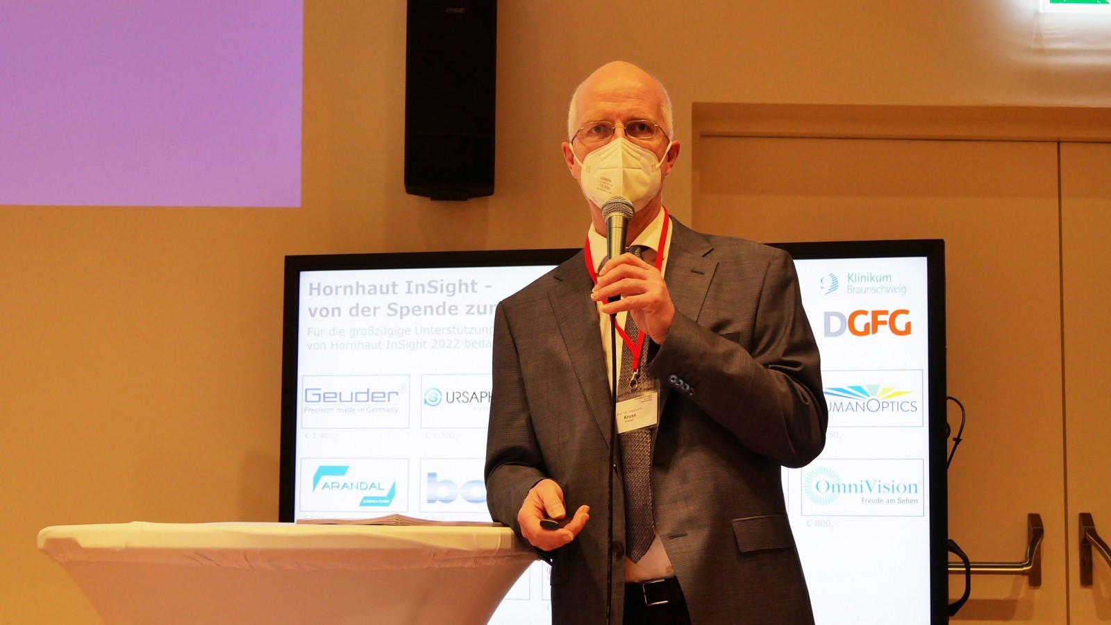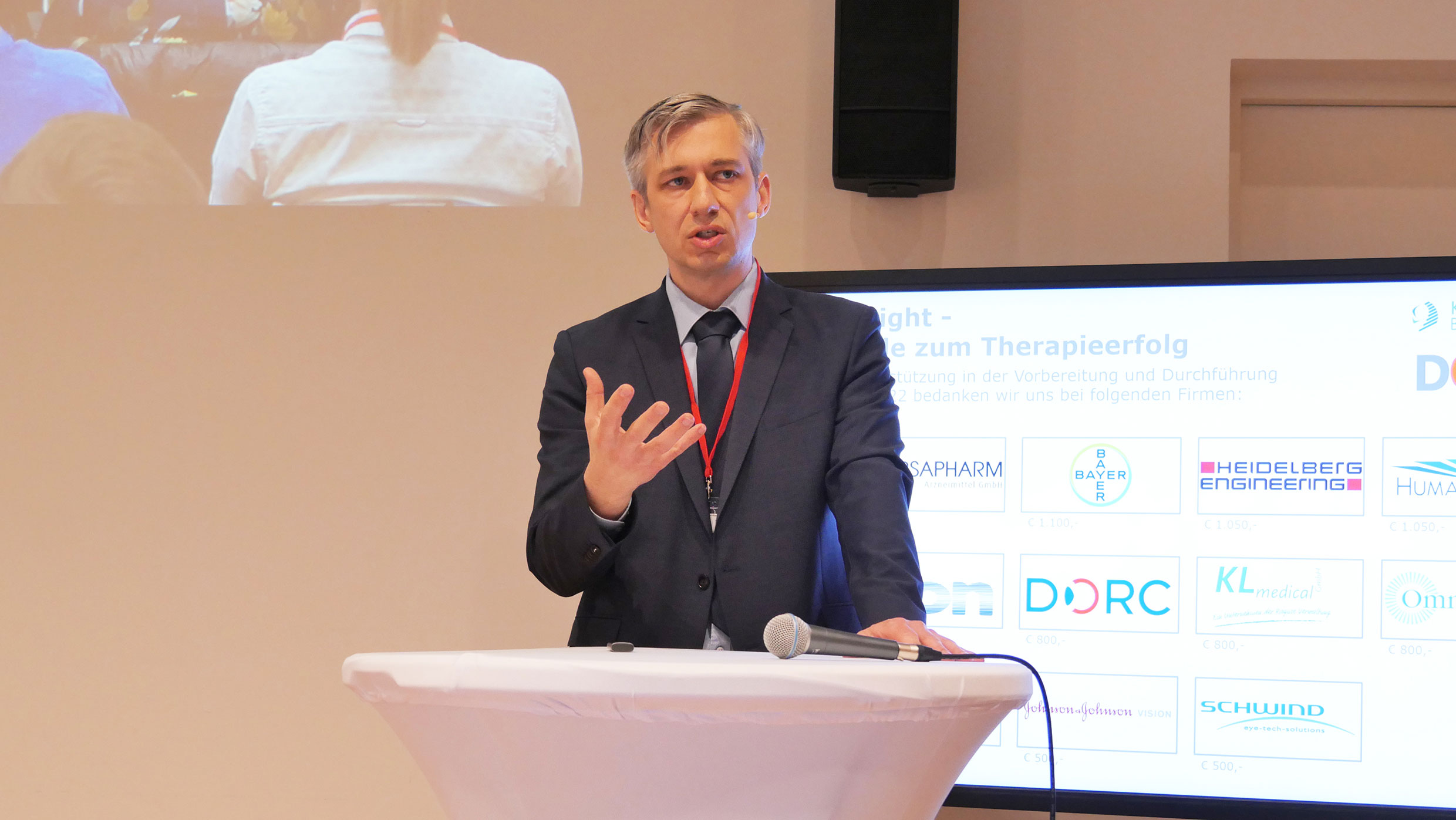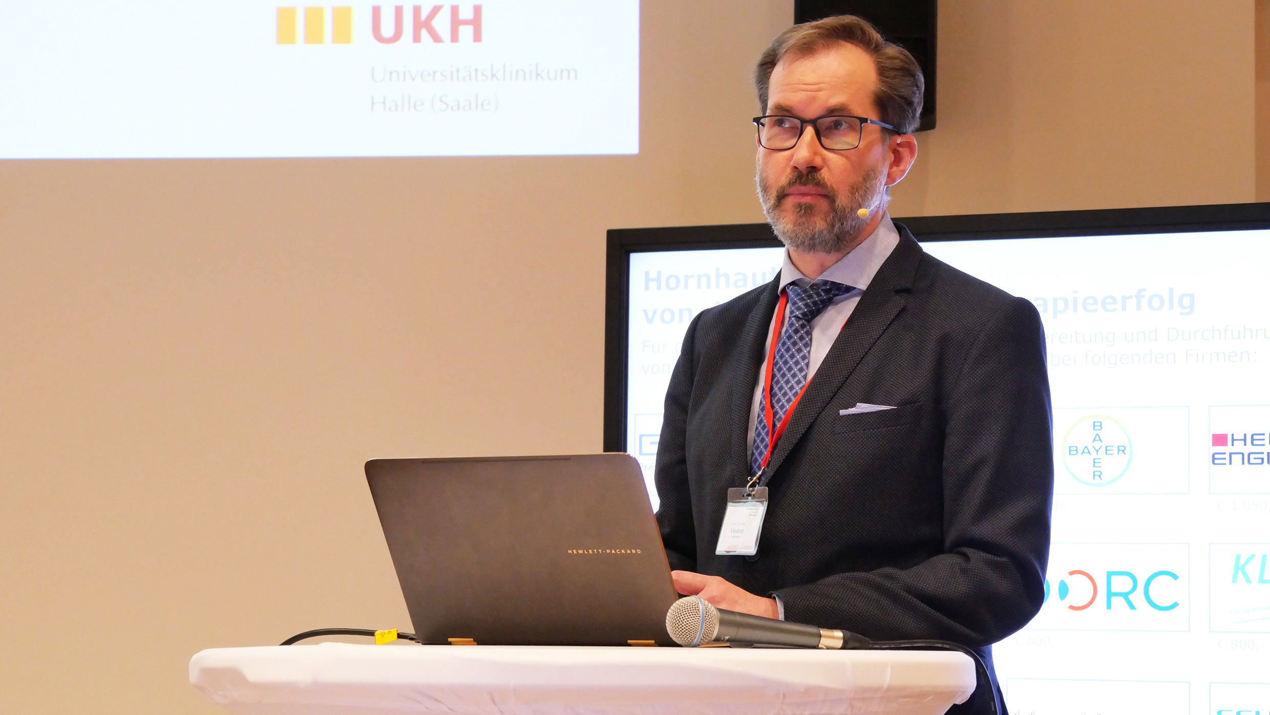 Im Anschluss stellte Professor Arne Viestenz, Leiter der Augenklinik am Universitätsklinikum Halle, nach Gedenken an den verstorbenen Hornhautspezialisten Prof. Gottfried O. Naumann komplexe Fälle und Behandlungswege schwerer Traumata am Auge vor. Hierbei appellierte Viestenz an die Teilnehmenden insbesondere bei Kindern sehr schnell zu handeln und zu operieren. Denn auch die Wundheilung im Auge verläuft bei Kindern im Vergleich zur Wundheilung bei Erwachsenen extrem schnell. Die Folge: Endothelzellen könnten sich im Auge dort ansiedeln, wo sie mehr schaden als nutzen und mitunter die Sehfähigkeit akut gefährden.