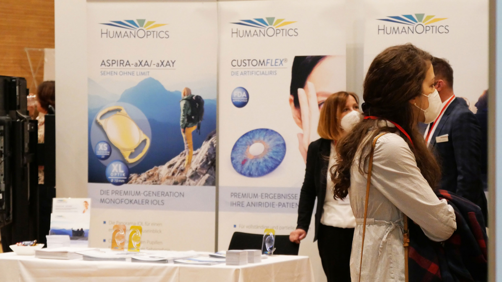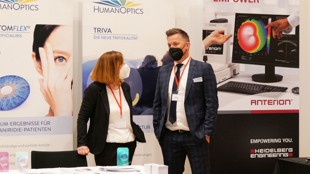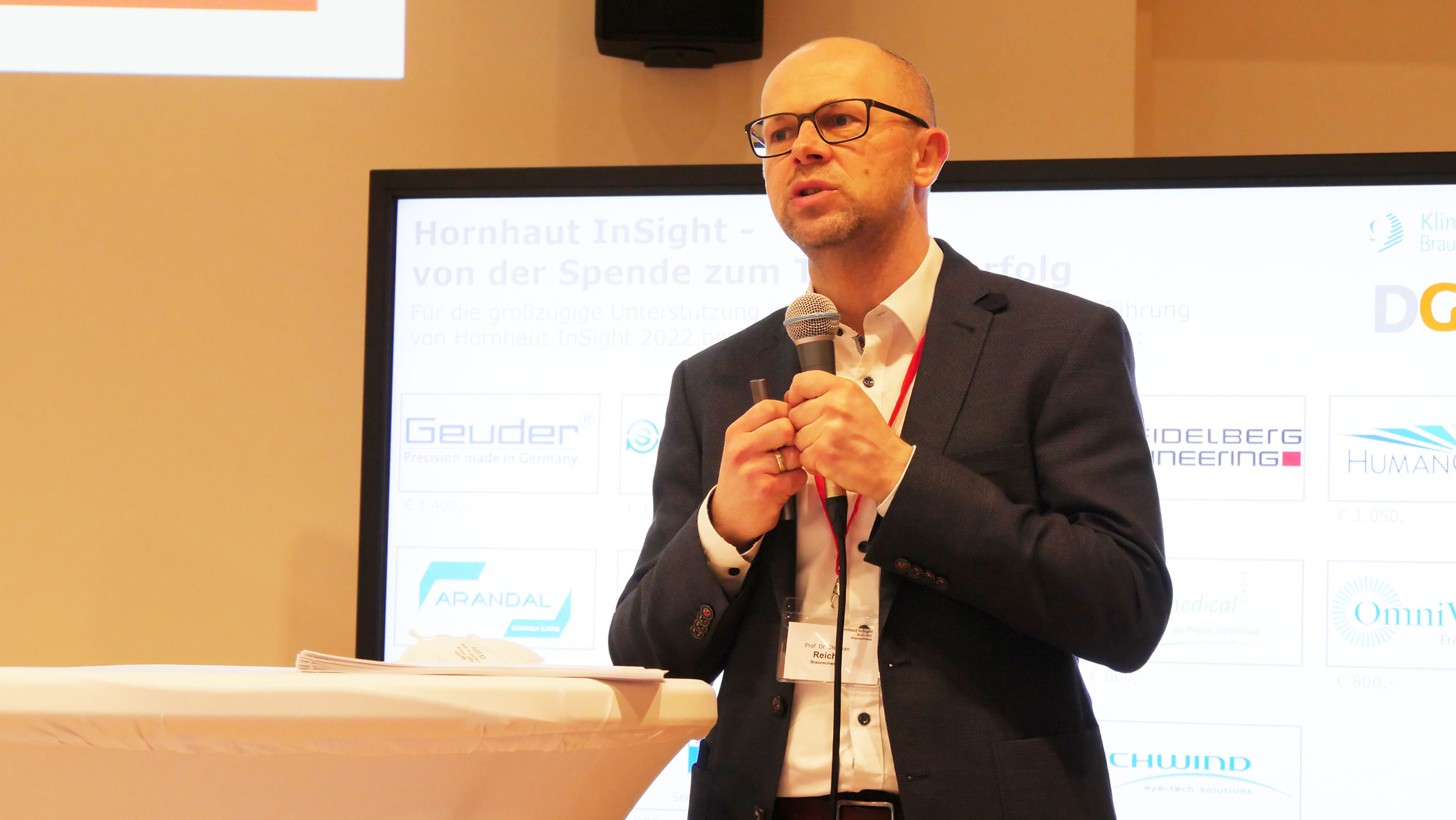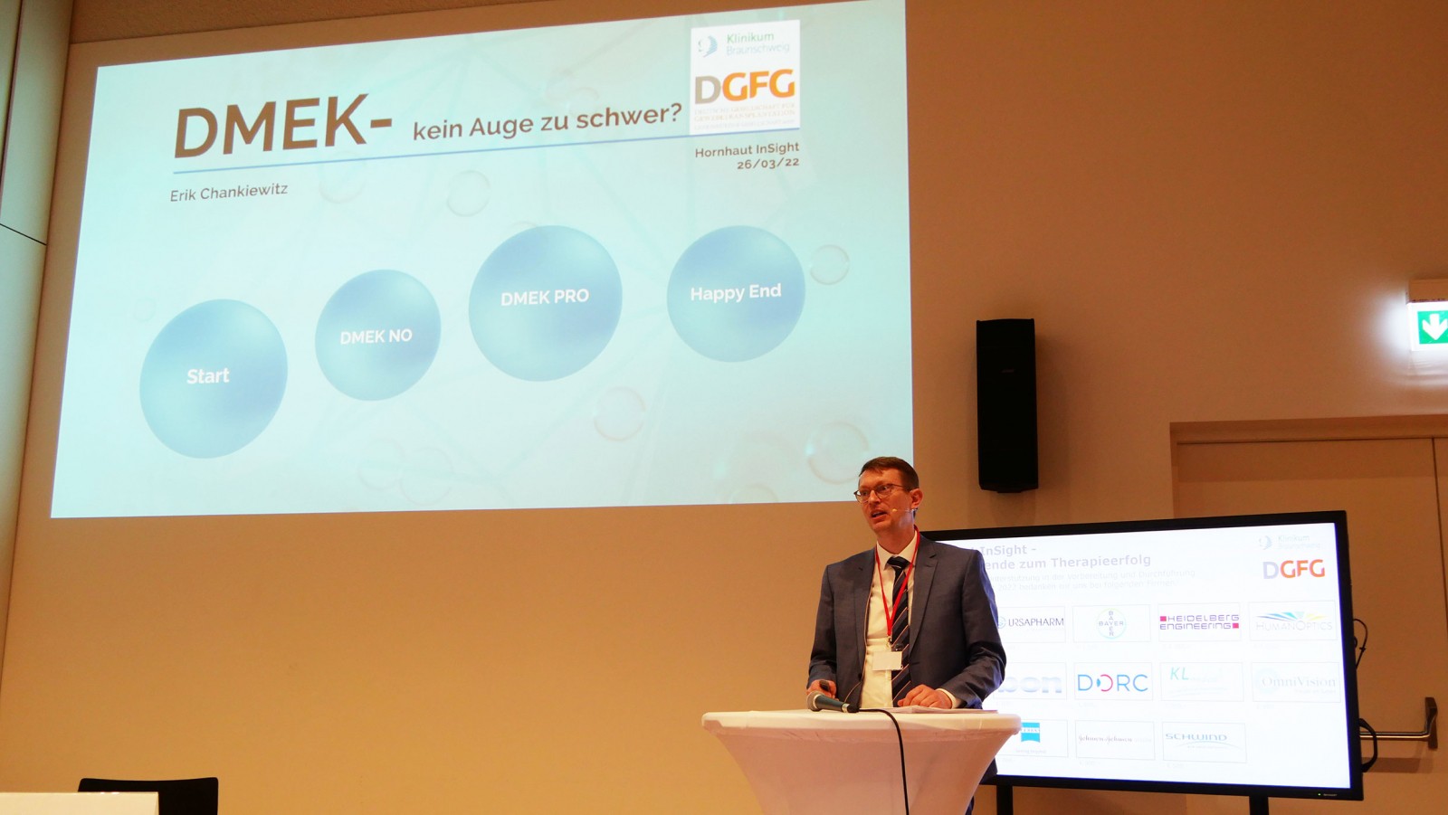 In seinem Vortrag „DMEK – kein Auge zu schwer?“ stellte Doktor Erik Chankiewitz die Herausforderungen für eine erfolgreiche DMEK-OP dar, die bereits beim Spendergewebe beginnen. Denn hier sollte das Spenderalter zwischen 65 und 80 Jahren liegen, damit das Gewebe nicht zu straff ist und gut im Auge platziert werden kann. Um das Gewebe und die empfindlichen, für klare Sicht sorgenden Pumpzellen der Augenhornhaut (Endothelzellen) nicht unnötig zu stressen, rät er den Teilnehmenden von einem Nachjustieren eher ab. Zum Teil können durch die flache Liegeposition der Patien*innen Erfolge in der korrekten Anhaftung des Transplantats an die übrige Hornhaut erzielt werden.