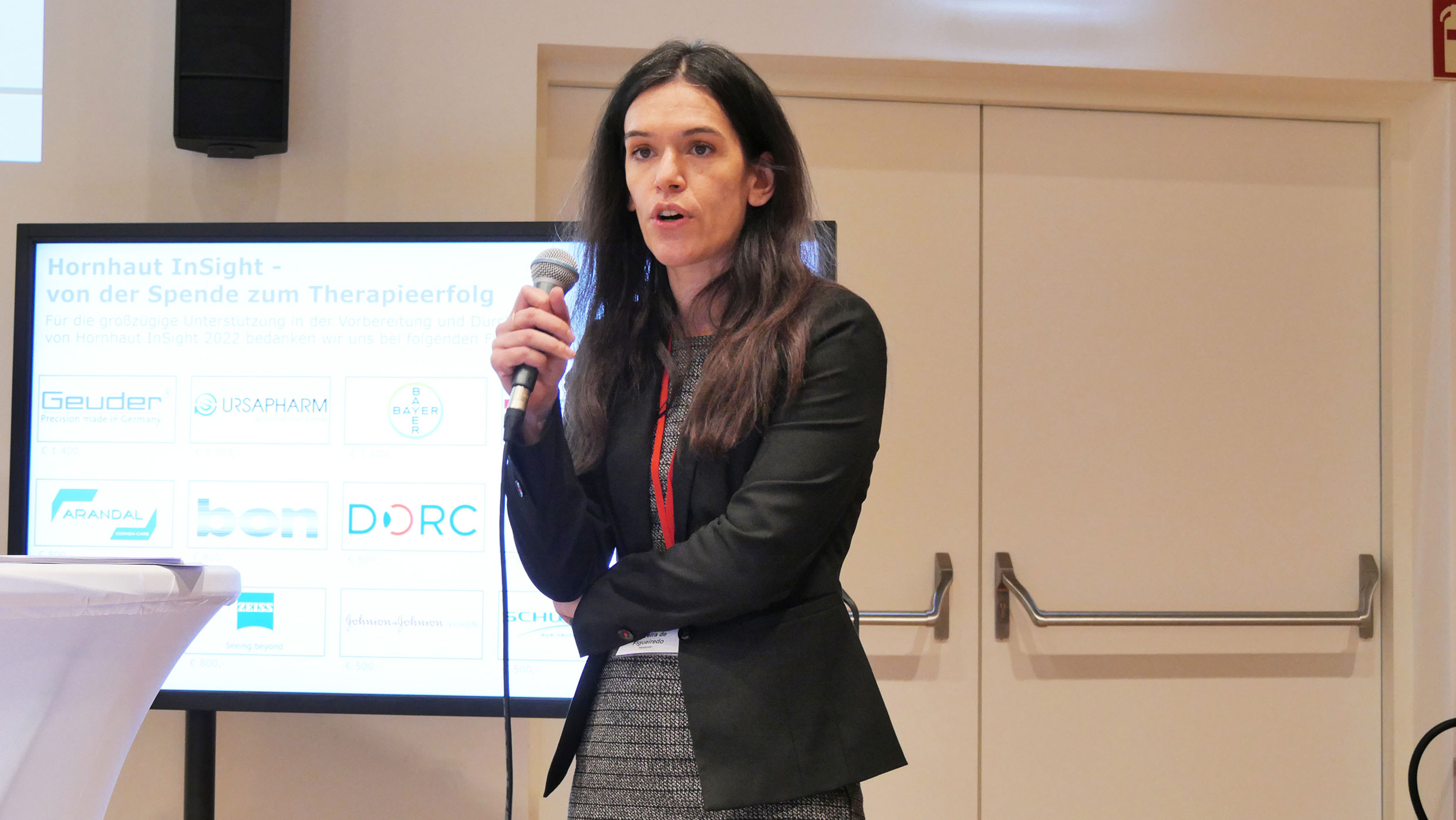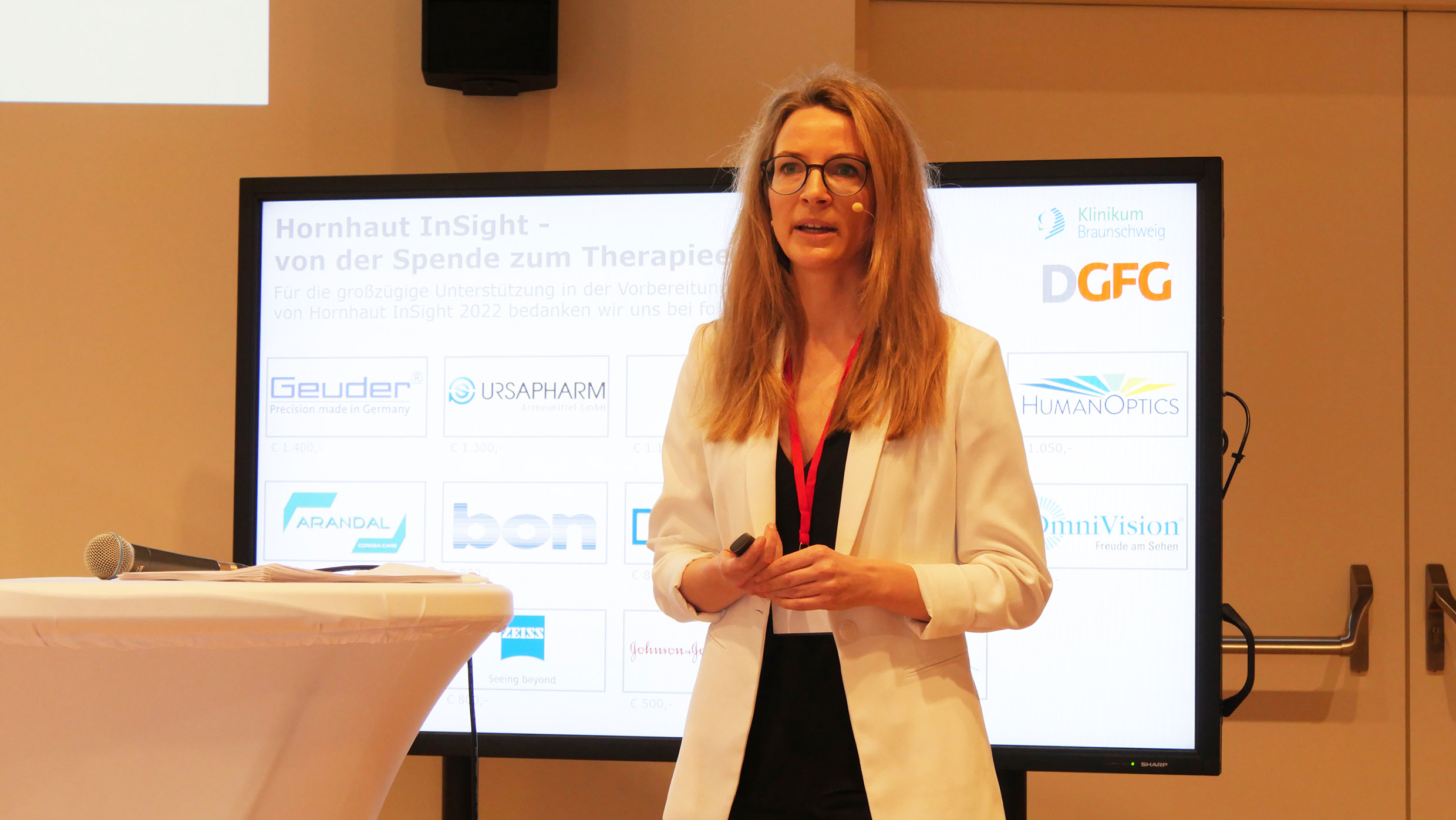 Doktor Nicola Hofmann, die den Bereich Forschung und Entwicklung bei der DGFG leitet, gab in ihrem Vortrag „Der Weg zu einem guten Transplantat“ Einblick in die Prozesse bei der DGFG, die hinter jedem einzelnen Transplantat am Ende stehen – angefangen von der Gewebespende, über die Prozessierung bis hin zur Zuteilung der Transplantate je nach Empfänger*in und Operationsmethode. All diese Prozesse werden von einem zentralen Qualitätsmanagement begleitet. Alle Mitarbeitenden werden in den jeweiligen Bereichen regelmäßig geschult. Somit wirkt in der Summe eine Vielzahl an Faktoren unabhängig von dem Gewebe als solches auf das Ergebnis eines guten Transplantats.