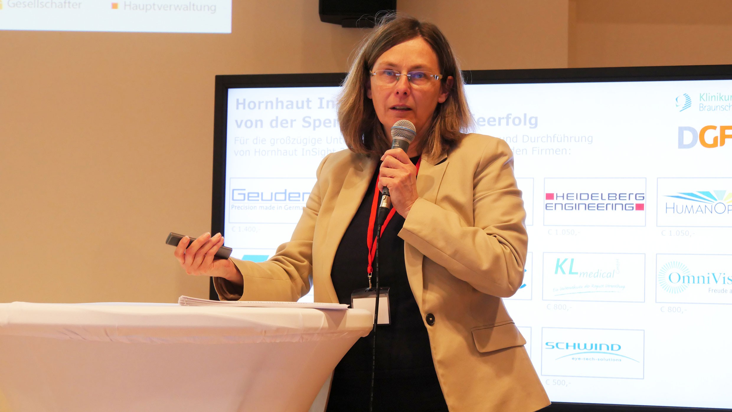 Einen Exkurs zur klinischen Anwendung bot Professor Stephan Reichl des Instituts für Pharmazeutische Technologie und Biopharmazie von der Technischen Universität Braunschweig. Er stellte in seinem Vortrag eine einzigartige Forschungsarbeit zu einer künstlichen Hornhaut vor. Die Idee: durch Tissue-Engineering mit einer in-vitro Rekonstruktion transplantierbarem Gewebe möglichst nahe zu kommen. Dabei wurden aus Spendergewebe einzelne Zellen isoliert und später auf künstlich hergestelltes Gewebe (Sheets) neu angesiedelt. Um der Dicke einer menschlichen Hornhaut möglichst nah zu kommen, wurden drei dieser Sheets übereinandergelegt. Vielversprechend sei hier eine Langzeitkultivierung mit Vitamin C. Um am Ende dieses Gewebekonstrukt möglichst klar zu haben, hat sich ein serumfreies Nährmedium bewährt.