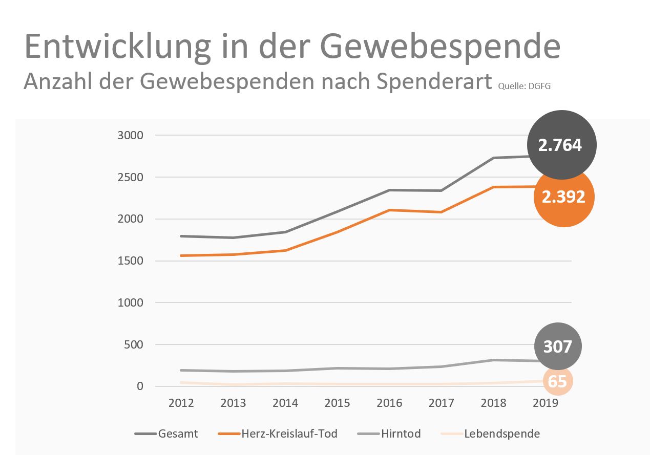3.007 Menschen bzw. deren Angehörige haben in 2019 einer Gewebespende zugestimmt. 2.764 Gewebespenden konnten schließlich im Netzwerk der gemeinnützigen Deutschen Gesellschaft für Gewebetransplantation (DGFG) realisiert werden; das entspricht einem Anstieg um 1,2 Prozent gegenüber dem Vorjahr. „Wir sind sehr dankbar, dass Krankenhäuser zunehmend die Gewebespende und damit eine Versorgung der Patientinnen und Patienten ermöglichen. Das ist sehr hervorzuheben, denn diese Unterstützung ist nicht selbstverständlich!”, so Martin Börgel, Geschäftsführer der deutschlandweit tätigen DGFG.