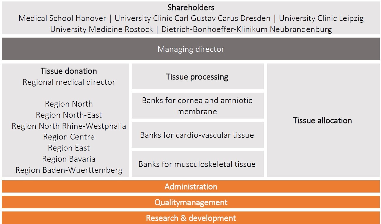 Since 2005, the registered office of the company has been in Hanover, the capital of Lower Saxony. Here – in the Medical Park, close to the Hannover Medical School – 20 employees work in administration and tissue allocation. Almost 50 coordinators for tissue donation are active in seven regions, from Mecklenburg-Western Pomerania to Bavaria, throughout Germany.