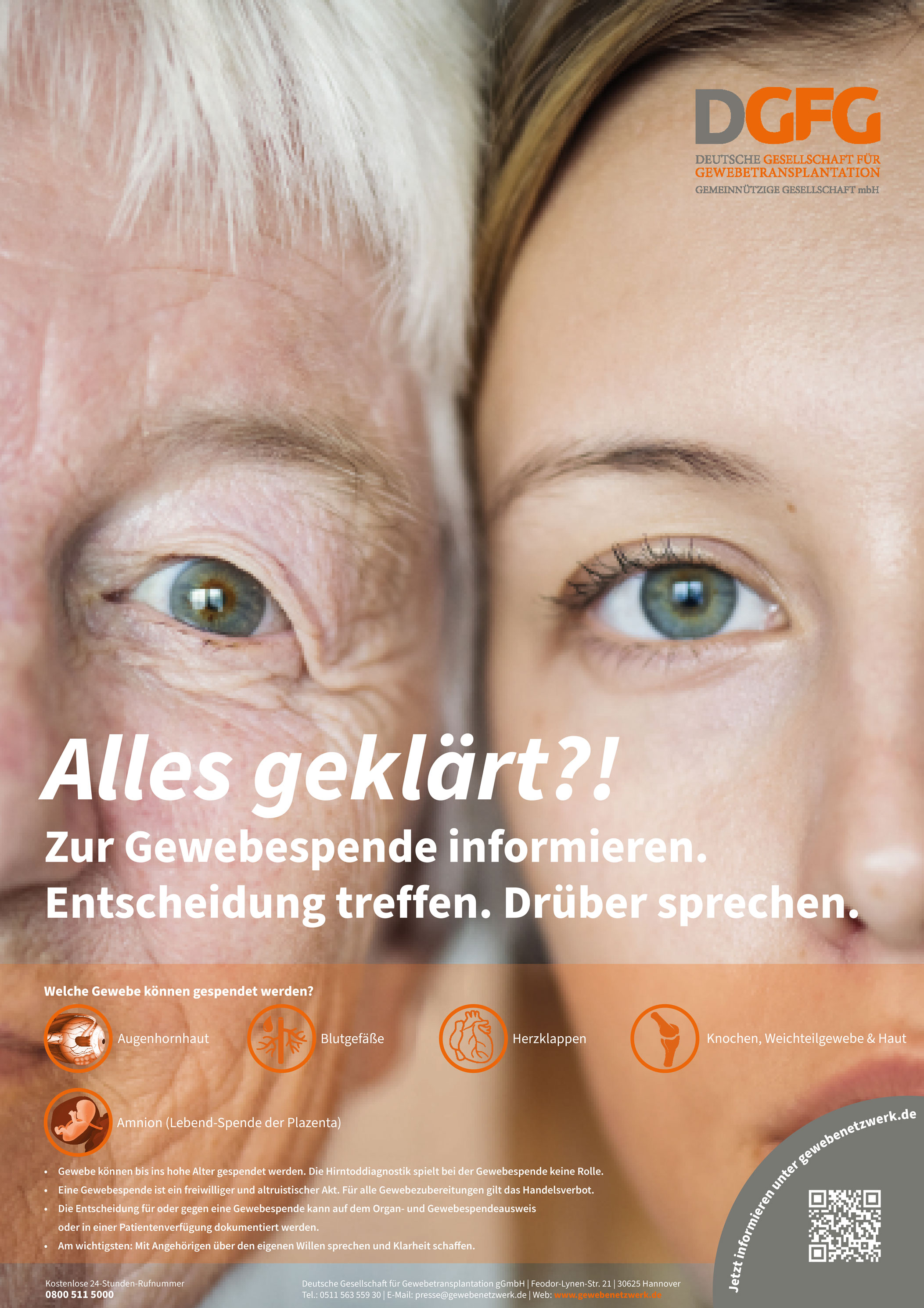 Gewebespende und Gewebetransplantation sind komplexe Themen. Wenn Sie sich weiter informieren möchten, schauen Sie sich bitte unser Infomaterial zum Download an. Die Information der Öffentlichkeit, aber auch von medizinischen Fachkreisen zur Augenhornhautspende, zur Spende von Herzklappen und Blutgefäßen oder zur Gewebetransplantation ist uns ein wichtiges Thema. Gerne kommen wir auch zu Ihren Veranstaltungen und klären zur Gewebespende und Arbeit der DGFG auf.
