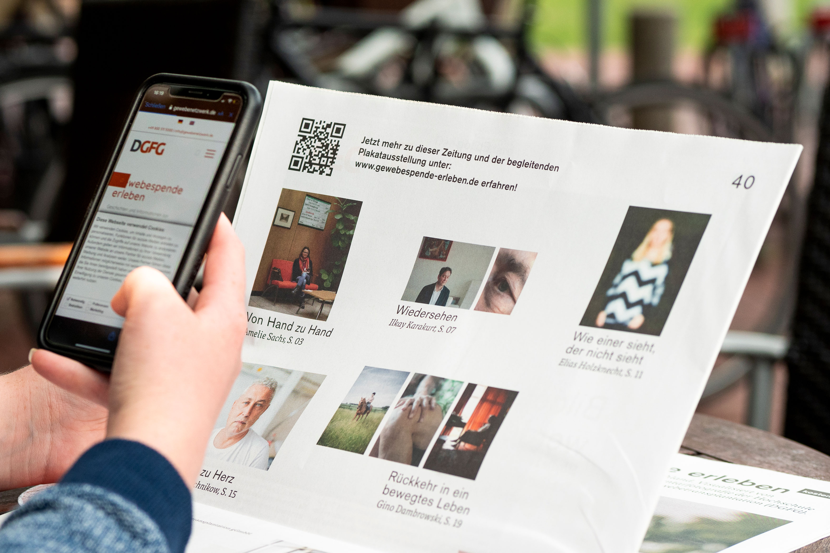 Unter www.gewebespende-erleben.de können die Fotografien bereits angeschaut werden. Für die öffentliche Aufklärungs- und Bildungsarbeit steht außerdem eine Fotoausstellung zur Verfügung, die emotionale Fotografien und sachliche Textinformation vereint. Eine Zeitung begleitet die Ausstellung und informiert tiefergehend auf 40 Seiten über die Gewebespende, das Projekt und die Fotografiestudierenden. Bislang wurde dieses ausgezeichnete Fotografieprojekt ausschließlich in Kliniken ausgestellt. Doch das soll sich ändern: Ausstellungsorte im öffentlich zugänglichen Raum sowie Förderer sind händeringend gesucht. Ausstellungsideen und -formate nimmt die Pressestelle der DGFG (presse@gewebenetzwerk.de) entgegen.