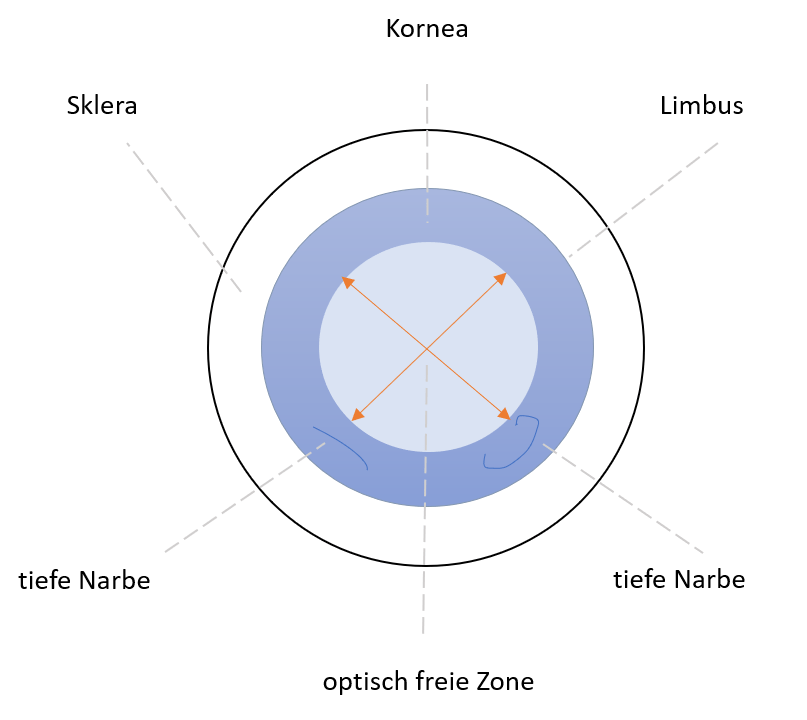 Problematisch sind die Narben, die beim Austausch der trüben Linse durch eine Kunstlinse entstehen. Dafür werden mehrere Schnitte am Auge gesetzt, die alle Hornhautschichten, auch die Descemet Membran mit den wichtigen Endothelzellen, durchdringen. Die daraus resultierende tiefe Vernarbung erschwert die Abpräparation der Lamelle. Unter Umständen nimmt das dann mehr Zeit in Anspruch und die Zellen werden zusätzlich beeinträchtigt. Außerdem begrenzen Position und Größe der Narben die freie optische Zone – ein weiteres wichtiges Qualitätskriterium bei den Spenderhornhäuten. Misst die freie optische Zone von Narbe zu Narbe, also im Durchmesser weniger als acht Millimeter, schlagen viele Transplantationszentren das Angebot aus, da die gestanzte Lamelle in diesem Fall höchstens einen Durchmesser von 7,5 Millimeter haben kann. Für bestimmte Patienten wäre diese optische Zone zu klein.