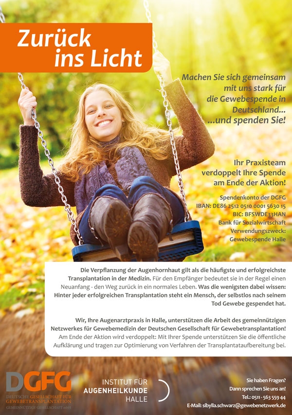 Die DGFG und das Institut für Augenheilkunde Halle vereint ein gemeinsamer Wunsch: Menschen das Augenlicht zu retten! Bei Augenerkrankungen der Hornhaut hilft manchmal nur noch eine Hornhauttransplantation. Diese sogenannte Keratoplastik führen Ärzte schon seit über einhundert Jahren erfolgreich aus. Jetzt haben sich das Institut für Augenheilkunde und die DGFG für eine ganz besondere Aktion entschlossen. Die von Professor Gernot Duncker geleitete Augenpraxis am Rathenauplatz in Halle/Saale unterstützt die gemeinnützige Arbeit der DGFG.