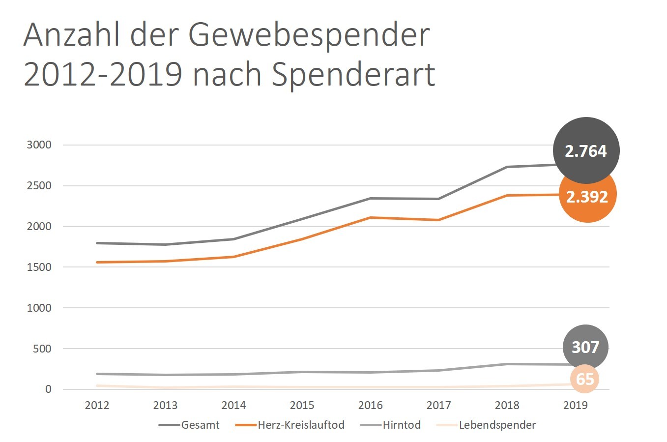 Voraussetzung für alle Erfolge in der Gewebetransplantation sind Gewebespenden. Der Bedarf an Gewebetransplantaten in Deutschland könnte komplett aus nationalen Spendeprogrammen gedeckt werden. Pro Jahr versterben etwa 900.000 Menschen in Deutschland. Schätzungen gehen davon aus, dass etwa zwei Drittel dieser Verstorbenen mögliche Gewebespender sind. Diese Zahlen ergeben für die Gewebespende eine ganz andere Ausgangsbasis als für Organspenden. Für diese kommen etwa 4.000 Verstorbene in Frage. Voraussetzung für eine Organspende ist u.a. der endgültige, nicht behebbare Ausfall der Gesamtfunktion des Gehirns, der sogenannte Hirntod. Gewebespenden sind hingegen auch bei Menschen möglich, die im normalen Herz-Kreislauftod verstorben sind. Auch ein hohes Lebensalter oder eine Krebserkrankung ist kein Ausschlussgrund. Ein Arzt muss zur Todesfeststellung sichere Todeszeichen, wie Totenflecke und Leichenstarre, festgestellt haben. Gewebespenden sind in jedem Krankenhaus möglich.