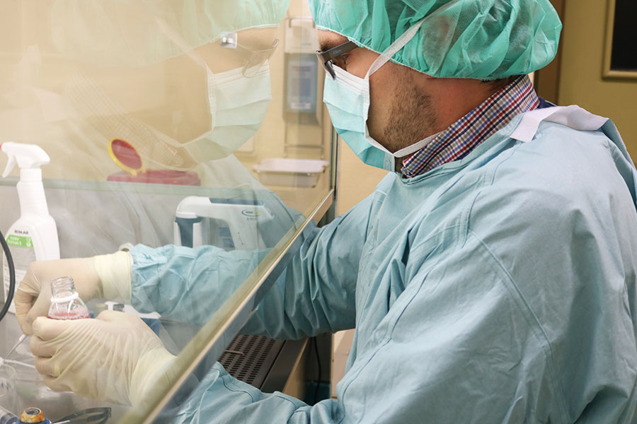 Ich bin eigentlich Diplomingenieur mit Fachrichtung Biotechnologie und habe aber schon während des Studiums in Kliniken und dabei in den verschiedensten Abteilungen und Forschungsprojekten mit Mensch, Tier, Pflanze und Zelle gearbeitet. Danach habe ich meine Diplomarbeit am Krebsforschungszentrum hier in Heidelberg geschrieben. Für meine Promotion ging ich an das Botanische Institut. Mir war es wichtig, keine Tierversuche durchführen zu müssen. Für Biologen sind Mensch, Tier oder Pflanze auf molekularer Ebene sehr ähnlich. Ich war dann für drei Jahre in Neustadt an der Weinstraße und habe dort ein Labor aufgebaut und etabliert. Das hat mir sehr viel Spaß gemacht. Als das dann fertig war, habe ich 2015 die Stelle im Forschungslabor in der Augenklinik gefunden. Dort werden u. a. Studien mit Augenlinsen durchgeführt. Im Juli 2017 wurde ich dann QM-Beauftragter und wissenschaftlicher Leiter der Lions Hornhautbank. Prof. Auffahrt hatte mich damals gefragt, ob ich neben dem Forschungslabor auch die Hornhautbank mit betreuen wollte. Bis Anna bei uns anfing habe ich zusätzlich noch die Gewebespenden realisiert.