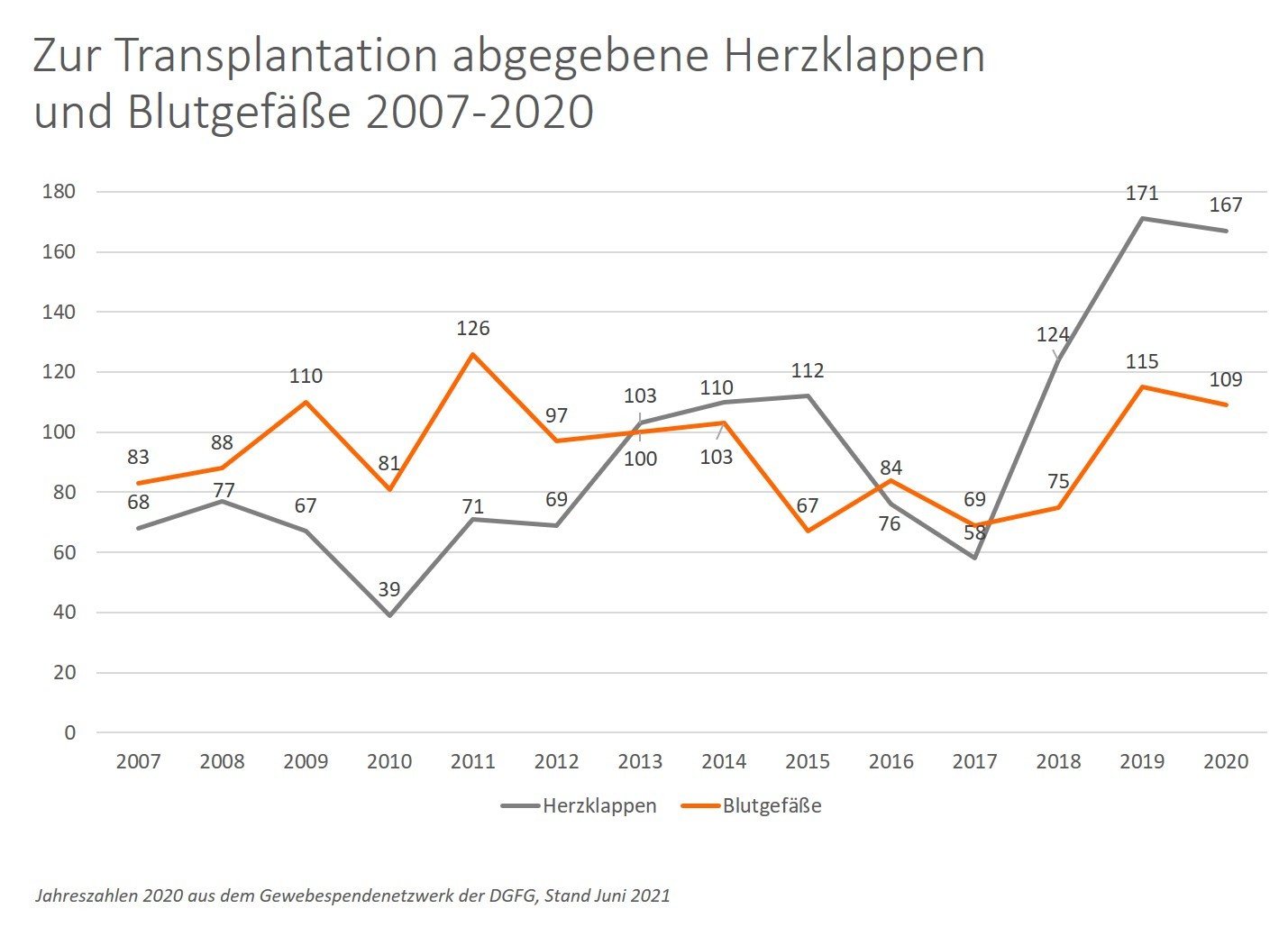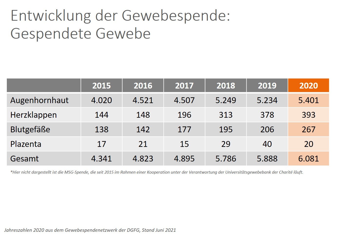 393 Mal spendete ein Mensch im vergangenen Jahr sein Herz mit den darin enthaltenen Pulmonal- und Aortenklappen. Darüber hinaus konnte die DGFG 267 Blutgefäße für die Aufbereitung zum Transplantat gewinnen. Diese kardiovaskulären Gewebe stammen zum Großteil aus der Organspende. Weil diese seit Jahren auf niedrigem Niveau stagniert, ist auch in 2020 der Anteil von Gewebespenden bei Organspenderinnen und -spendern mit elf Prozent des gesamten Spendeaufkommens bei der DGFG sehr gering. Dabei ist der Bedarf an Herzklappen und Blutgefäßen hoch: Entzündet sich eine künstliche Herzklappe- oder Gefäßprothese, kann die Transplantation humanen Spendergewebes Leben retten. Auch angeborene Herzfehler führen zu einem frühzeitigen Verschleiß der Herzklappen und erfordern meist eine Gewebetransplantation. Die DGFG intensiviert daher Programme zur Spende von Herzklappen und Blutgefäßen bei Herz-Kreislauf-Verstorbenen. Eine Entnahme dieser Gewebe ist noch bis zu 36 Stunden nach Todeseintritt möglich. 38 solcher Gewebespenden nach Herzkreislauf-Tod konnte die DGFG in 2020 realisieren – ein Plus um sieben Spenden im Vergleich zum Vorjahr.