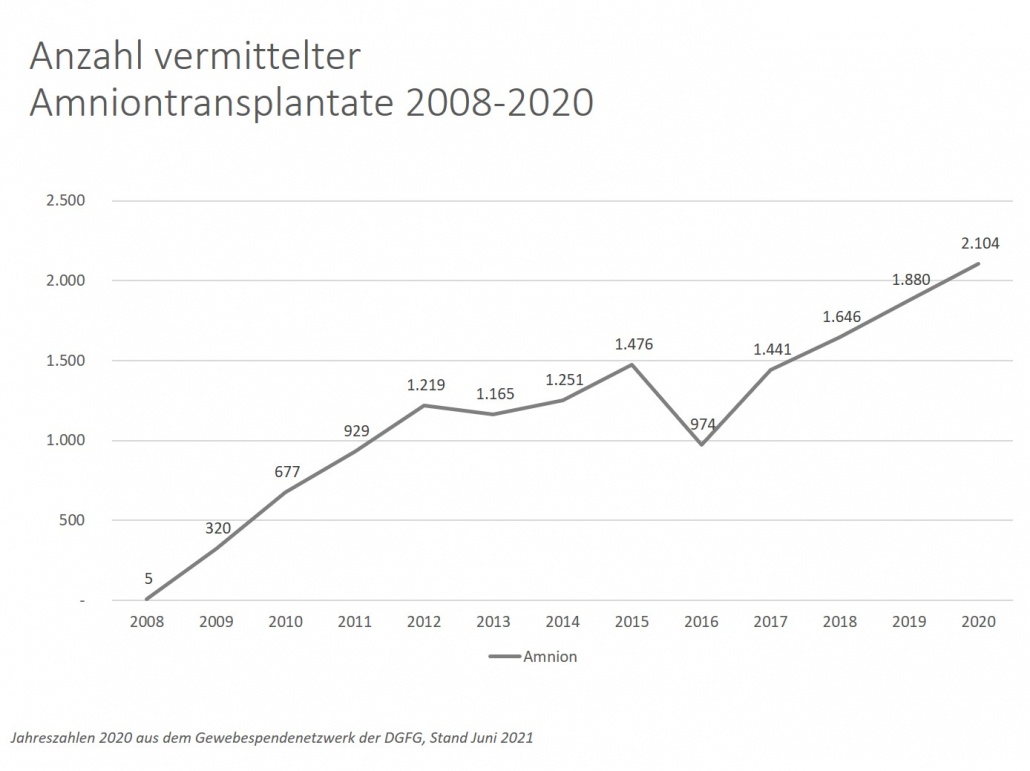 52 Lebend-Gewebespenden konnte die DGFG in 2020 realisieren. Zur Lebend-Gewebespende zählt die Spende der Plazenta und der darin enthaltenen Amnionmembran im Rahmen einer geplanten Kaiserschnittgeburt. In der Augenheilkunde kommt sie zur Behandlung der Hornhautoberfläche zum Einsatz und kann als AmnioClip-plus eingespannt in ein Ringsystem ähnlich wie eine Kontaktlinse auf das erkrankte Auge gelegt werden. 100 solcher Transplantate vermittelte die DGFG in 2020.