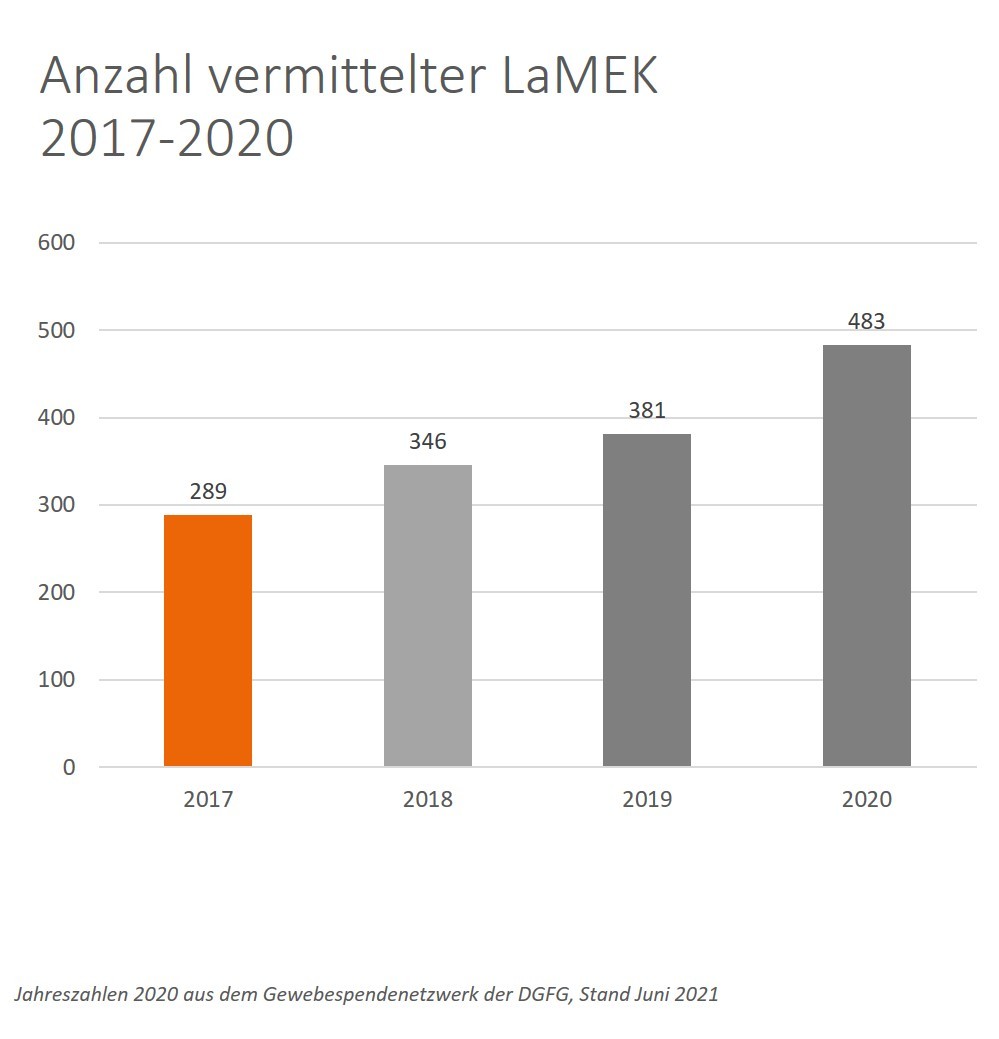 Im Rahmen der 2.816 Gewebespenden konnte die DGFG 6.081 Gewebepräparate gewinnen. Mit rund 90 Prozent ist die Augenhornhaut dabei das am meisten gespendete Gewebe in 2020. 5.401 Augenhornhäute wurden in den elf Hornhautim bundesweiten Netzwerk der DGFG zu Hornhauttransplantaten aufbereitet. Sie verhelfen Patientinnen und Patienten zu mehr Sehleistung oder bewahren sogar vor dem Erblinden. Mit 3.984 vermittelten Augenhornhauttransplantaten stammt bei jährlich rund 9.000 durchgeführten Hornhauttransplantationen [1] deutschlandweit fast die Hälfte der Transplantate von der DGFG. Unter diesen waren 483 in der Gewebebank vorpräparierte Hornhautlamellen (LaMEK) für die Descemet Membrane Endothelial Keratoplasty (DMEK). Bei dieser Operationstechnik erholt sich die Sehfähigkeit der Patientinnen und Patienten sogar noch schneller: Hier wird nur die Lamelle, d. h. die ultradünne Schicht der Descemet-Membran mit Endothelzellen der Augenhornhaut ersetzt.