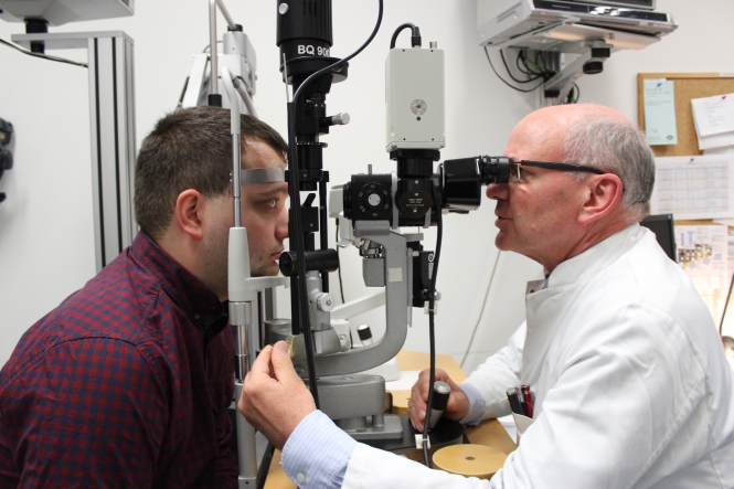 Prof. Clemens kontrolliert die Hornhauttransplantation von Sebastian Busch an der Spaltlampe.