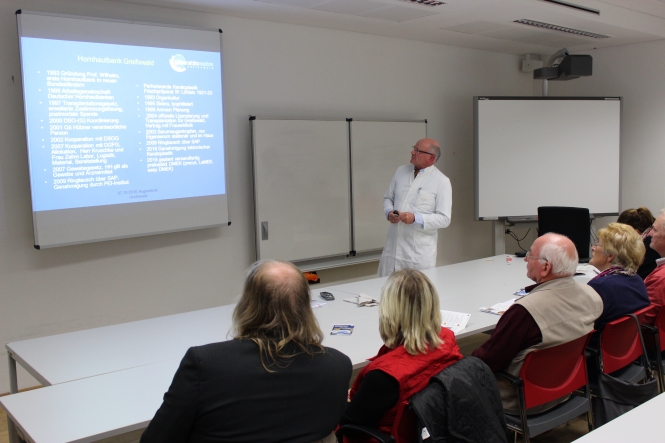 Die Hornhautbank Greifswald blickt auf eine lange Tradition zurück: Sie wurde Anfang 1993 in MV gegründet und war damit die erste Augenhornhautbank in den neuen Bundesländern. Die Hornhautbank Greifswald ist Teil der Klinik und Poliklinik für Augenheilkunde in der Universitätsmedizin Greifswald. Die Bank wurde gegründet, um primär die eigenen Patienten der Uniklinik Greifswald zu versorgen. „Inzwischen transplantieren Ärzte aus ganz Deutschland Hornhäute aus Greifswald“, sagt Dr. Frank Polster, Regionalleiter der DGFG. Seit 2007 hat die Hornhautbank Greifswald einen Kooperationsvertrag mit der DGFG. Beide Einrichtungen arbeiten seitdem eng zusammen. „Das hat sich als eine sehr fruchtbare Zusammenarbeit herausgestellt“, sagt Prof. Clemens. Inzwischen stehen in MV weit mehr Hornhäute zur Verfügung als Ärzte im Gesundheitsland im Norden im Rahmen einer Hornhauttransplantation verpflanzen, erfahren die Gäste auf dem Patientenforum Greifswald. Alle gespendeten Hornhäute werden über das Netzwerk der DGFG an transplantierende Krankenhäuser und Ärzte vermittelt. Die Prozessierung, die Aufbereitung der Gewebespenden, übernimmt dabei die Hornhautbank Greifswald. Prof. Stefan Clemens ist seit dem 1. Oktober 1994 ärztlicher Leiter. Verantwortliche Person ist seit 2001 Dr. Dorothea Hübner, Stationsärztin in der Augenklinik Greifswald.