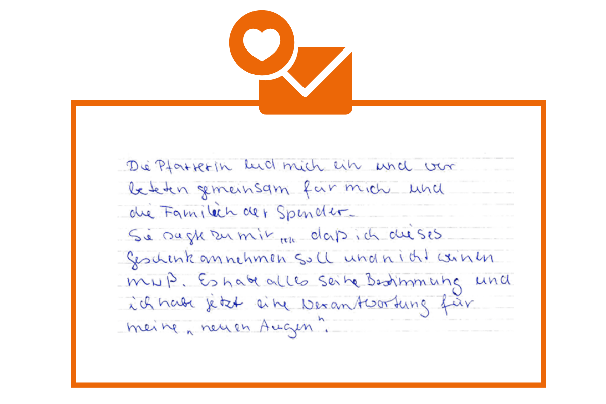 Mir liegt am Herzen, den Familien der Spender*innen Danke zu sagen. Mein Augenlicht wurde mir durch sie und ihre Angehörigen wiedergeschenkt. Ich achte Sie sehr und bin dankbar.