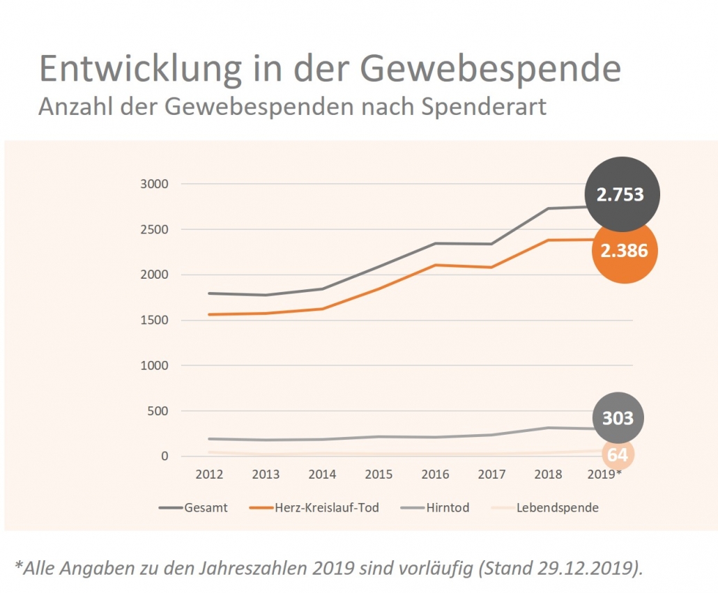 Hannover, 01.01.2020 – 40 Prozent der Angehörigen stimmten in 2019 einer Gewebespende zu. Die Deutsche Gesellschaft für Gewebetransplantation (DGFG) konnte dadurch erstmalig 2.753 Gewebespenden realisieren und bundesweit 5.740 Gewebetransplantate zur Transplantation vermitteln. Für die Patientinnen und Patienten hieß das 5.740-mal die Chance auf einen Neuanfang: So können Hornhauttransplantate klare Sicht schenken, Herzklappen die Leistungsfähigkeit erhöhen und Gefäßtransplantate vor Amputationen bewahren.