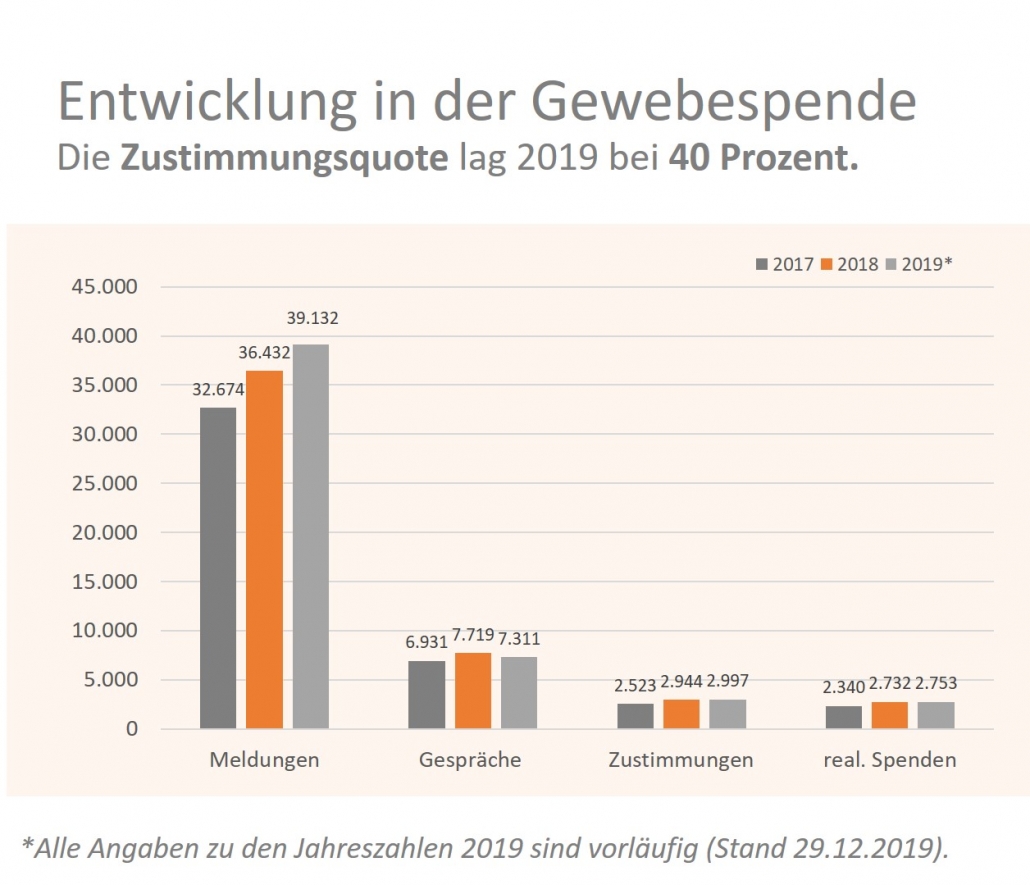 Erneut konnte die gemeinnützige DGFG mehr Gewebespenden realisieren: In 2019 spendeten insgesamt 2.753 Menschen ihr Gewebe. In 2018 waren es 2.732 Menschen. „Spender*innen und ihren Angehörigen gilt unser besonderer Dank“, betont Martin Börgel, Geschäftsführer der DGFG. Insgesamt gingen 39.132 Meldungen potenzieller Spender*innen aus den Kliniken im Netzwerk bei der DGFG ein. Nach deren Prüfung auf medizinische Kontraindikationen führten die Koordinator*innen 7.565 Gespräche, um über die Möglichkeit der Gewebespende aufzuklären. 2.997-mal wurde einer Gewebespende zugestimmt. Die durchschnittliche Zustimmungsquote zur Gewebespende lag damit bei 40 Prozent – ein deutliches Zeichen, dass Gewebespende als gesamtgesellschaftliche Aufgabe wahrgenommen wird.