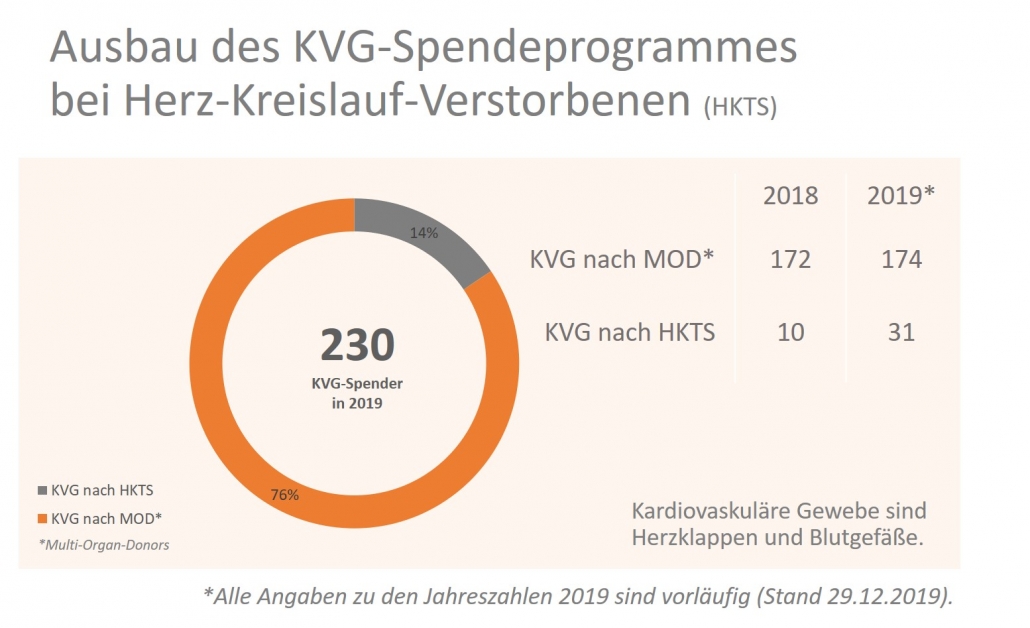 2019 konnte die DGFG 31 Spenden kardiovaskulärer Gewebe bei Herz-Kreislauf-Verstorbenen durchführen – mehr als dreimal so viele wie im Jahr zuvor. Bei dieser Spende entnehmen die Koordinator*innen zusammen mit einem Arzt das Herz mitsamt der Herzklappen oder auch die großen Blutgefäße. Insgesamt konnte die DGFG in 2019 166 Herzklappen und 111 Gefäße zur Transplantation vermitteln. Der Bedarf dieser Gewebe in der Transplantationsmedizin ist nach wie vor sehr hoch. Herzklappen und Blutgefäße stammten bisher aus der Organspende. Die DGFG hat daher in 2017 ein Programm zur Spende kardiovaskulärer Gewebe (KVG) von Herz-Kreislauf-Verstorbenen initiiert. Denn auch bei der Spende dieser Gewebe spielt der Hirntod keine Rolle. Herzklappen und Gefäße können noch bis zu 36 Stunden nach Todeseintritt entnommen werden.