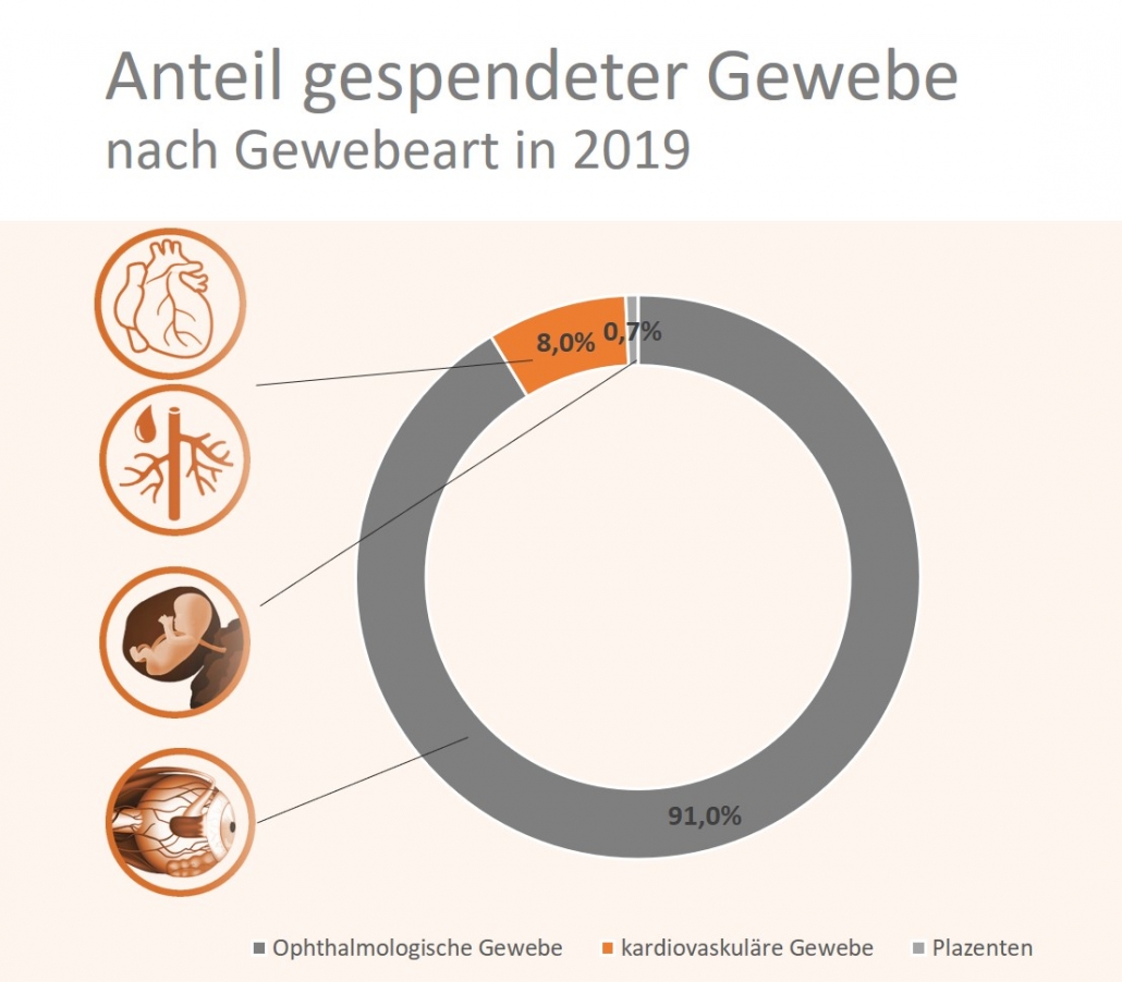 Gewebe, die nach dem Tod gespendet werden können, sind neben Augenhornhäuten, Herzklappen und Blutgefäßen auch Knochen, Sehnen, Bänder und Haut. Aus der Lebend-Gewebespende kommt die Amnionmembran. Der Anteil an Organspender*innen, die Gewebespender*innen sind, ist insgesamt sehr gering. Die Hirntoddiagnostik spielt bei der Gewebespende keine Rolle: 2.386 Gewebespender*innen und damit knapp 90 Prozent sind an einem Herz-Kreislauf-Stillstand verstorben.