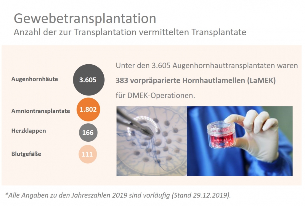 3.605 Patient*innen konnte die DGFG in 2019 mit einem Hornhauttransplantat versorgen. Im Durchschnitt werden pro Jahr rund 7.000 Hornhauttransplantationen in Deutschland durchgeführt. „Mehr als jede zweite Hornhaut kommt von der DGFG. Wir können mittlerweile bei der Hornhauttransplantation die meisten Anfragen innerhalb weniger Wochen erfüllen“, sagt Börgel. Unter den vermittelten Hornhäuten waren 383 Hornhautlamellen (LaMEK) für die DMEK-Operation (Descemet Membrane Endothelial Keratoplasty). Hier ersetzen Ärzte nur eine dünne Schicht der Hornhaut, wodurch sich die Sehfähigkeit der Patienten deutlich schneller erholt und das Infektionsrisiko minimal bleibt.