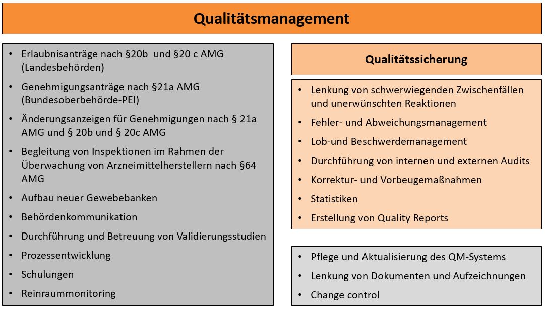 Das QM der DGFG gewährleistet gem. § 32 Absatz 1 der AMWHV (Arzneimittel- und Wirkstoffherstellungsverordnung) u. a., dass die Mitarbeiter alle Arbeitsabläufe, die die Qualität und Sicherheit der Gewebe und Gewebezubereitungen berühren, unter kontrollierten Bedingungen durchführen und dokumentieren. Das Zentrale QM übernimmt hierfür das Qualitätsmanagement der Gewebebanken vollständig oder berät und unterstützt im Rahmen von Kooperationen die Gewebebanken des gesamten DGFG-Netzwerks bei der Umsetzung vor Ort. Das Zentrale QM begleitet auch die Inspektionen gem. § 64 AMG durch die lokalen Landesbehörden.