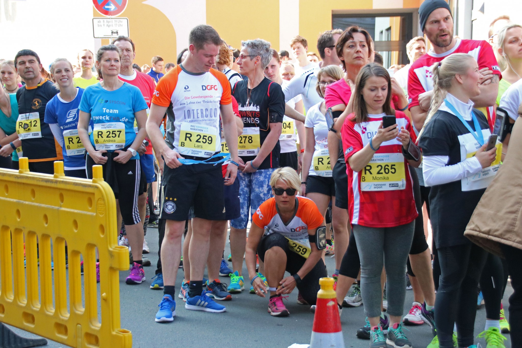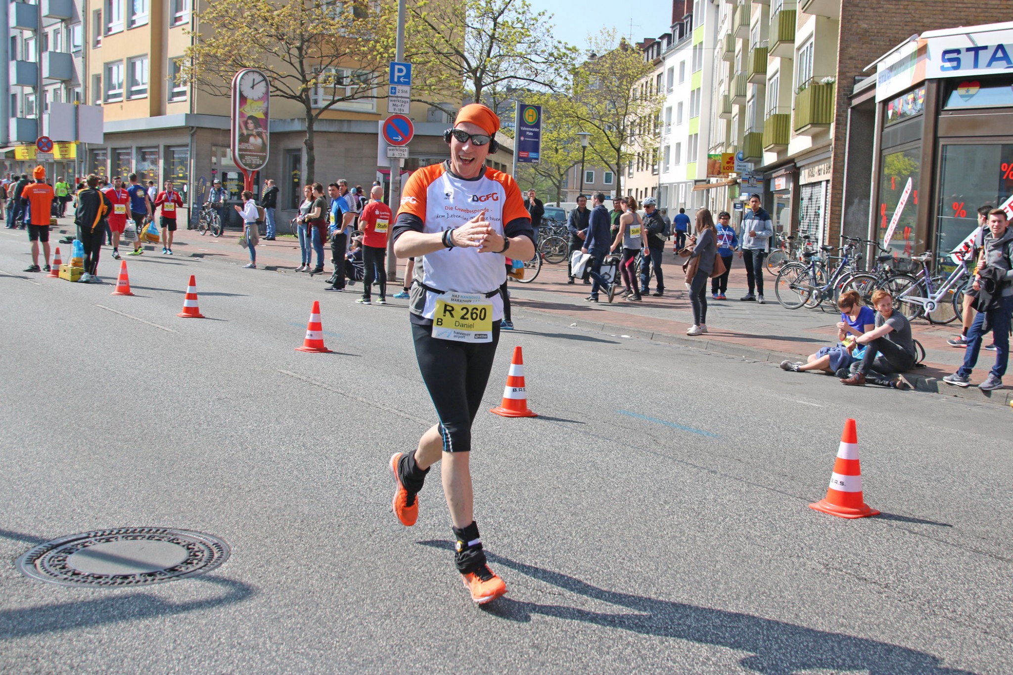 Pünktlich um 9.30 Uhr fiel am Sonntag, den 9. April der Startschuss für den Staffellauf beim Hannover Marathon. Unter den mehr als 22.000 Menschen, die auf den verschiedenen Strecken an den Start gingen, waren in diesem Jahr zum ersten Mal zwei Staffeln der DGFG mit dabei. Acht unserer Mitarbeiter liefen bei bestem Frühlingswetter, angefeuert von rund 250.000 Zuschauern, insgesamt mehr als 84 Kilometer für die Gewebespende. Finanziell unterstützt wurden die DGFG-Staffeln von der Veranstaltungsagentur Intercom Dresden GmbH. Nach weniger als vier Stunden liefen unsere acht Athleten über die Ziellinie. Die weiteste Anreise für den ersten Benefiz-Lauf der DGFG hatte Gewebespendekoordinator Sebastian Pfnür (1. v. l. oben): Er reiste für den Lauf aus Regensburg an. Koordinatorin Dr. Judith Friedrich (1. v. l. unten) aus Kiel hatte gleich ihre Familie im Schlepptau und damit ihr ganz persönliches Stimmungsteam zum Hannover Marathon mit dabei. Die approbierte Ärztin Anna Kreyenhop (2. v. r. unten), die das Team der ärztlichen Regionalleiter bei der DGFG unterstützt, kam aus Bremen in die niedersächsische Landeshauptstadt. Als begeisterte Hockey-Spielerin konnte sie sich dieses Sportevent nicht entgehen lassen. Aus Essen waren die beiden Koordinatoren Sabrina Schmidt (2. v. l. unten) und Daniel Lochmann (2. v. l. oben), der Marathoni in der DGFG, mit dabei. Vom Hauptsitz der DGFG aus Hannover gingen Sibylla Schwarz (1. v. r. unten), Jan Klerke (1. v. r. oben) und Lars Meier (2. v. r. oben) an den Start.